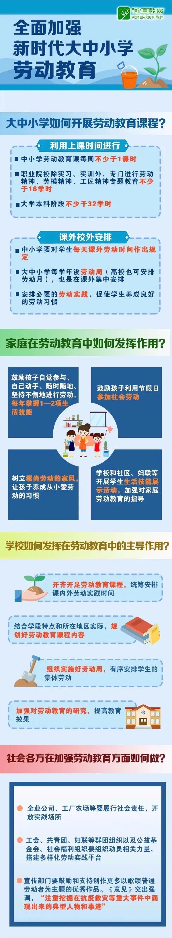 构建新时代 中国特色社会主义劳动教育体系 近日,中共中央、国务院印发了《关于全面加强新时代大中小学劳动教育的意见》(以下简称《意见》),就全面贯彻党的教育方针,加强大中小学劳动教育进行了系统设计和全面部署。 《意见》出台的背景是什么?大中小学将如何开展劳动教育?教育部有关负责人为你详解。 1.社会各界对新时代劳动教育十分关注,请介绍一下《意见》出台的背景。 答:劳动教育是中国特色社会主义教育制度的重要内容,对于培养社会主义建设者和接班人具有重要战略意义。《意见》出台主要有以下两个方面背景。 一是贯彻落实新时代党对劳动教育的新要求。2018年9月,习近平总书记在全国教育大会上明确提出将劳动教育纳入社会主义建设者和接班人的总体要求,必须构建大中小学劳动教育体系,全面落实党的教育方针。 二是劳动育人功能亟待加强。劳动教育被淡化、弱化,一些青少年中出现不珍惜劳动成果、不想劳动、不会劳动的现象,与社会主义建设者和接班人的培养要求有较大差距。全党全社会必须高度重视,切实加强大中小学劳动教育。 2.新时代加强劳动教育的总体思路是什么? 答:新时代加强劳动教育必须强调以习近平新时代中国特色社会主义思想为指导,落实立德树人根本任务,把劳动教育纳入人才培养全过程,贯通大中小学各学段,贯穿家庭、学校、社会各方面,与德育、智育、体育、美育相结合,把握育人导向,遵循教育规律,创新体制机制,注重教育实效,实现知行合一,促进学生形成正确的世界观、人生观、价值观。 3.《意见》对新时代劳动教育的基本内涵做了怎样的规定,为什么? 答:《意见》明确提出,实施劳动教育的重点是在系统的文化知识学习之外,有目的、有计划地组织学生参加日常生活劳动、生产劳动和服务性劳动,让学生切实经历动手实践,出力流汗,接受锻炼,磨炼意志。将劳动教育与智育区别开,防止用文化课的学习取代劳动教育。 4.新时代劳动教育主要育人目标是什么? 答:针对一些青少年中出现的不珍惜劳动成果、不想劳动、不会劳动的现象,《意见》从思想认识、情感态度、能力习惯三个方面面向全体学生提出了劳动教育目标,突出强调劳动教育的思想性。强调理解和形成马克思主义劳动观,牢固树立劳动最光荣、劳动最崇高、劳动最伟大、劳动最美丽的观念;体会劳动创造美好生活,体认劳动不分贵贱,热爱劳动,尊重普通劳动者,培养勤俭、奋斗、创新、奉献的劳动精神;具备满足生存发展需要的基本劳动能力,形成良好的劳动习惯。 5.大中小学各学段教育,普通教育和职业教育各有特点,请问《意见》在劳动教育课程、时间上是如何规定的? 答:落实劳动教育需要依托课程,必须有一定的时间做保证。在课程设置上,《意见》突出强调“整体优化学校课程设置”,构建劳动教育课程体系,大中小学设立必修课程和劳动周,同时强调其他课程有机融入劳动教育内容和要求。在劳动教育时间上,《意见》主要从两个方面作出规定,一是利用上课的时间进行。中小学劳动教育课每周不少于1课时;职业院校除实习、实训外,专门进行劳动精神、劳模精神、工匠精神专题教育不少于16学时;大学本科阶段不少于32学时。二是在课外校外安排。中小学要对学生每天课外劳动时间作出规定。大中小学每学年设劳动周(高等学校也可安排劳动月),也是在课外集中安排。安排必要的劳动实践,旨在促使学生养成良好的劳动习惯。 6.《意见》为什么突出强调开展日常生活劳动、生产劳动、服务性劳动三类劳动教育? 答:《意见》依据马克思主义劳动观,将劳动分为生产劳动和非生产劳动,相应地将劳动教育分为生产劳动教育和非生产劳动教育。考虑到劳动教育内容的针对性和可行性,《意见》又将非生产劳动教育分为日常生活劳动教育和服务性劳动教育,前者注重在学生个人生活自理中强化劳动自立意识,体验持家之道,这也是学生健康发展、适应社会生活的重要基础;后者具有较强的时代特点,注重利用知识、技能、工具、设备等为他人和社会提供服务,特别是在公益劳动、志愿服务中强化社会责任,培养良好的社会公德,例如:强调高等学校“注重培育公共服务意识,使学生具有面对重大疫情、灾害等危机主动作为的奉献精神”。三类劳动教育内容不同,各学段可以有所侧重,但从总体上看,三者都很重要,不能偏废。 7.如何发挥家庭在劳动教育中的作用?对此,《意见》有哪些具体要求? 答:家长是孩子的第一任老师,家庭是实施劳动教育的重要场所。《意见》从四个方面强调发挥家庭在劳动教育中的基础作用:一是鼓励孩子自觉参与、自己动手、随时随地、坚持不懈地进行劳动,每年掌握1—2项生活技能;二是鼓励孩子利用节假日参加社会劳动;三是树立崇尚劳动的家风,让孩子养成从小爱劳动的习惯;四是学校和社区、妇联等开展学生生活技能展示活动,加强对家庭劳动教育的指导。 8.学校如何发挥在劳动教育中的主导作用? 答:《意见》明确提出学校要切实承担劳动教育的重要责任,主要任务是:第一,开齐开足劳动教育课程,统筹安排课内外劳动实践时间;第二,结合学段特点和所在地区实际,规划好劳动教育课程内容,注重马克思主义劳动观、有关劳动技能的学习;第三,组织实施好劳动周,有序安排学生的集体劳动;第四,加强对